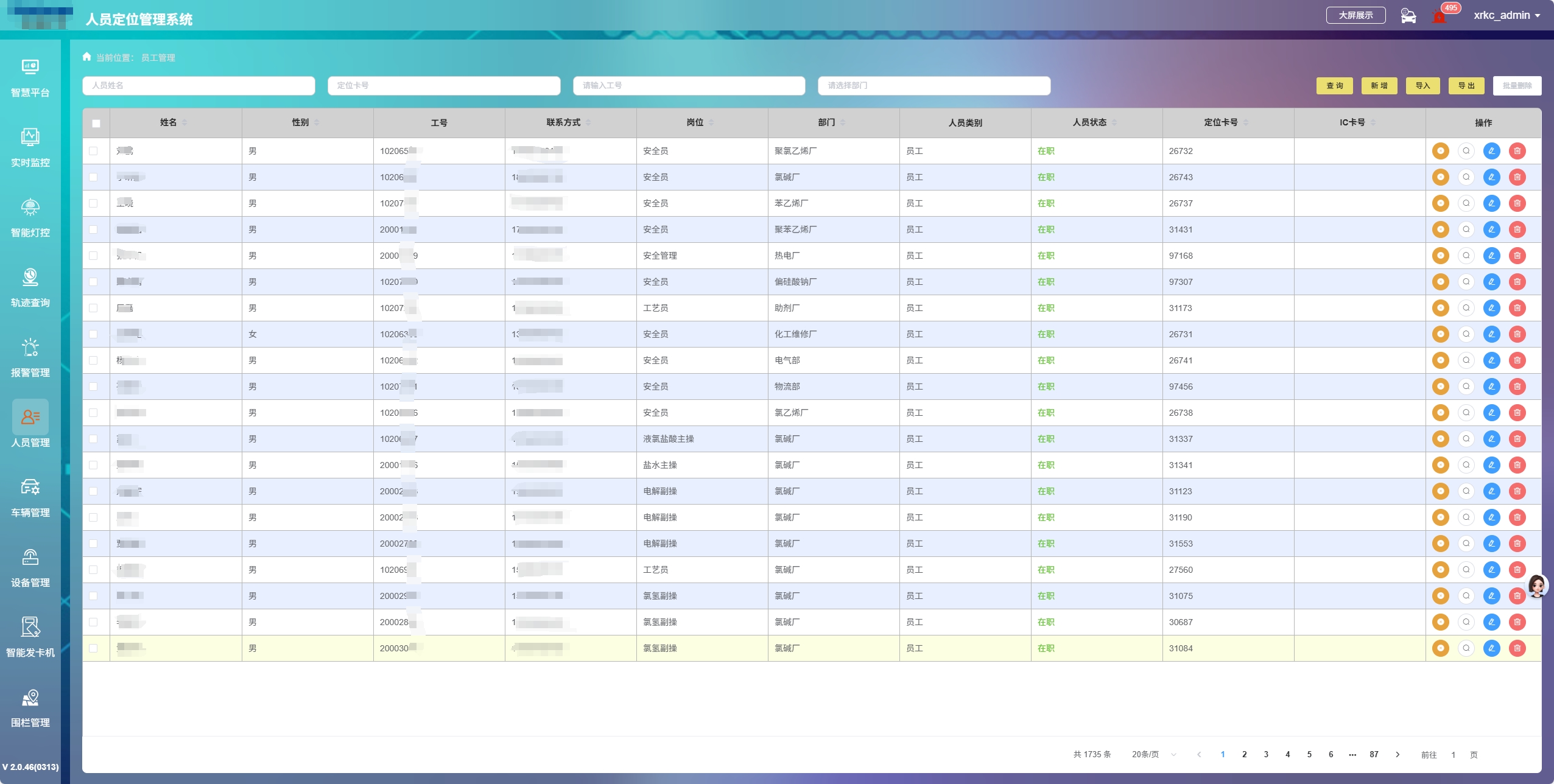 系統具備完善的人員管理和設備管理功能。在人員管理方面,管理者可以通過管理平臺對員工信息進行集中管理,包括員工的基本信息、崗位信息等。在設備管理方面,系統可以對定位終端設備、定位基站以及其他相關設備進行實時監控和管理,包括設備的運行狀態、電量情況等。一旦設備出現故障或異常情況,系統能夠及時發出警報,提醒維護人員進行維修,確保設備的正常運行,保障定位系統的穩定性和可靠性。