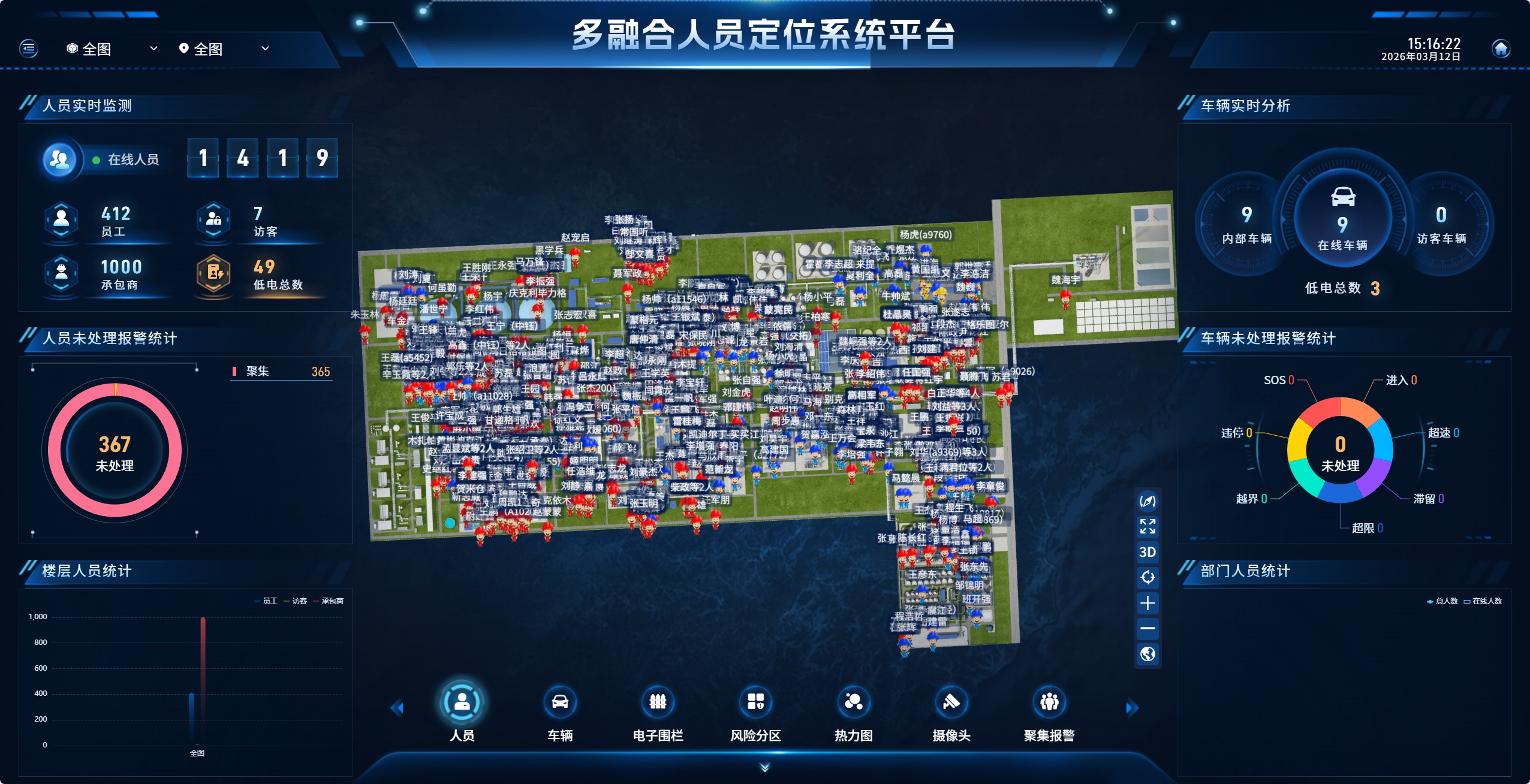 新銳科創(chuàng)人車定位系統(tǒng)集成實時定位、電子圍欄、軌跡回放、智能預(yù)警、車輛調(diào)度、數(shù)據(jù)分析等全功能模塊。管理平臺基于GIS技術(shù)構(gòu)建園區(qū)2D/3D數(shù)字孿生模型,可直觀可視化呈現(xiàn)人員、車輛實時位置與分布狀態(tài),操作簡潔、界面友好。系統(tǒng)支持多級權(quán)限管理、多端數(shù)據(jù)同步,管理人員可通過PC端、移動端隨時隨地查看數(shù)據(jù)、處置預(yù)警。同時,系統(tǒng)可與園區(qū)視頻監(jiān)控、門禁、消防、報警等系統(tǒng)無縫對接,實現(xiàn)數(shù)據(jù)互通、聯(lián)動處置,構(gòu)建一體化智慧管理平臺,形成“定位+監(jiān)控+預(yù)警+處置”的全閉環(huán)管理體系。
